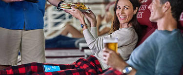 Vous avez faim pendant un film au Movies Under the Stars®? En vous relaxant sur la piazza, vous voulez déguster votre boisson préférée ? Ou vous voulez tout simplement éviter les foules et les files d'attente pendant vos vacances ? Commandez tout ce dont vous avez besoin - hamburgers, bière, gâteau au chocolat, cocktails et bien plus encore - et nous vous l'apporterons directement, sans frais. Veuillez garder une distance suffisante, vous mettre à l'aise et continuer à profiter d'un excellent service.